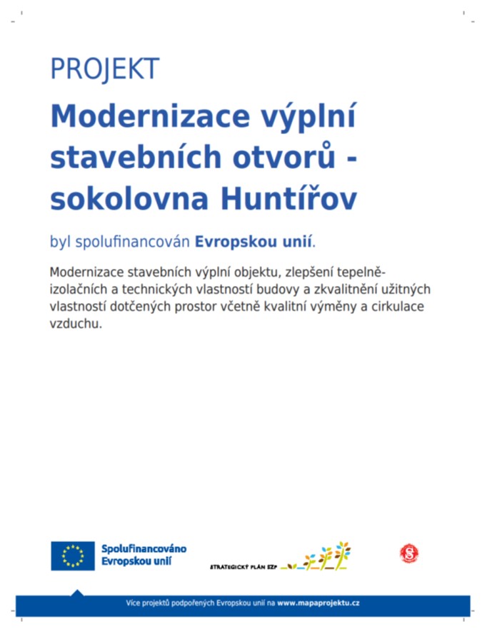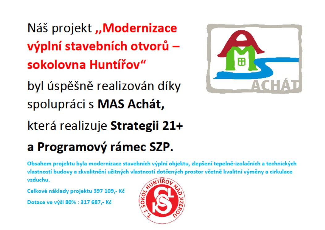 Náš projekt ,,Modernizace výplní stavebních otvorů - sokolovna Huntířov“ byl spolufinancován Evropskou unií ve spolupráci s MAS Achát, která realizuje Strategii 21+ a Programový rámec SZP.